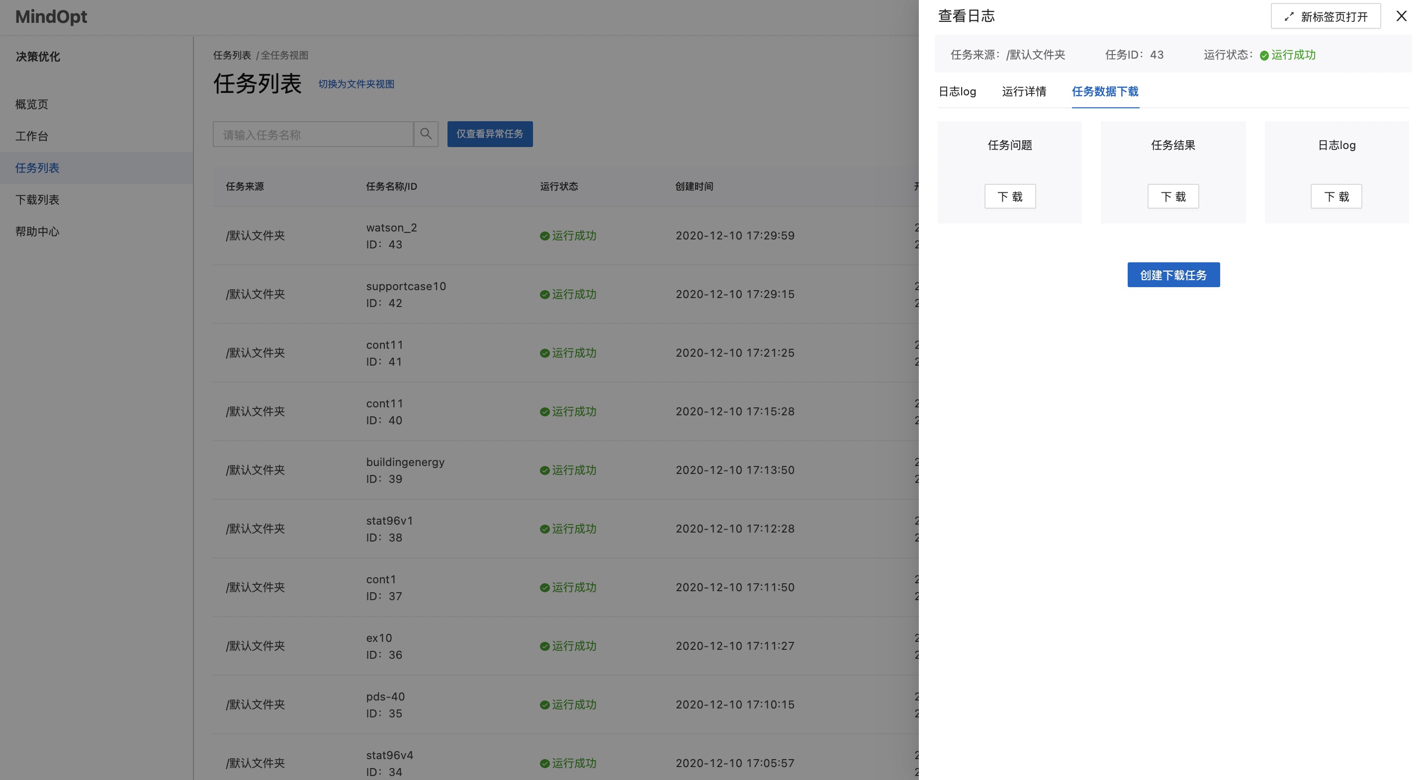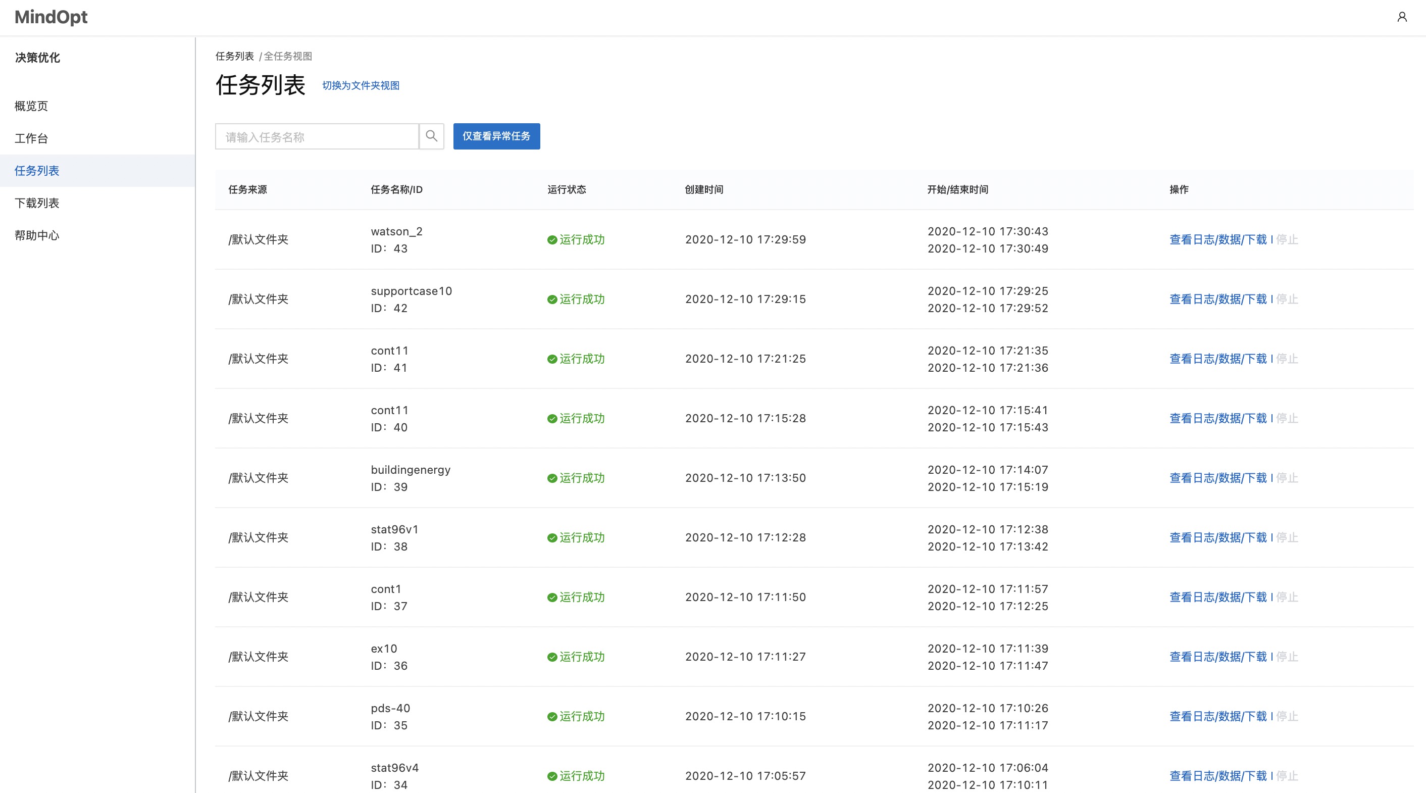 All jobs received by the compute server are displayed in this list. You can clear jobs when the job data occupies a high proportion of the disk space. The job list provides a full-list view and a folder view. You can view the logs and data statistics, and download the model, result, and logs of each job separately. In the folder view, you can view the statistics of all jobs under the folder, and package and download the entire folder.